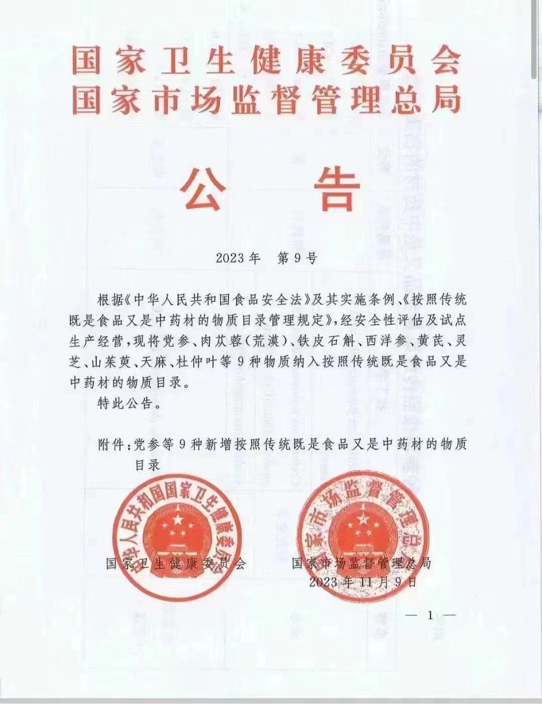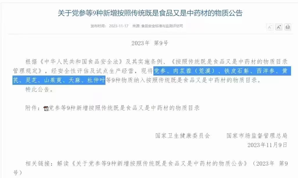 关于党参等9种新增按照传统既是食品又是中药材的物质公告